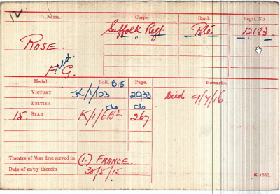 Born in Q3-1896 [Newmarket 3b:525], in Exning,  son of Frederick and Sarah ROSE (née ASHBY) of Landwade Road, Exning. 1901 census...At Landwade Road, Exning were Frederick G[4] with his father Frederick W. [30] a coach painter/coachman born Kentish Town, London, his mother Sarah Road [32] born Exning, sisters Matilda M [7] and Edith E [2] and brother Alfred [1] all born Exning, plus grandfather Robert Ashby [80] 1911 census...At Brickfields Cottages, Exning were Frederick George [14] now a farmboy, his parents, sisters Matilda Maud and Edith Emma, brothers Alfred William and Cecil Robert [4] born Exning and sister Hilda May [9] born Exning. One sibling had died. [30-4-1895] at St Martin's Church, Exning on 27th November 1916 was registered with him as Frederick G. ROSE. His son Frederick James (just to carry on the forename confusion ) was born 25-6-1917, never to see his father. The family nwere at Valley Farm Dairy, Exning on the pension card. CWGC have Frederick's forename as George. An Army clerk somehow seems to have erred in an entry on Frederick's Medal Index Card (below) by giving the wrong date of his death. One has to assume that CWGC, "Soldiers Died and "Our Exning Heroes" have it correct His brother in law Joseph PERRY mentioned below, died of his wounds on 18th September 1917 and is named on the Newmarket War Memorial.  |