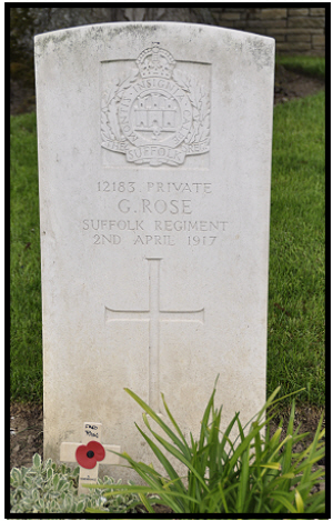 Frederick's entry in "Our Exning Heroes" reads as follows: Rose, F.G. 7th Suffolks Frederick George Rose volunteered at the outbreak of the war, although he was at the time considerably under age, and after a few months training went out to France. He was married in Exning Church to Rosina May Woodbridge on November 27th, 1916, and leaves one little boy. He was killed in action on April 2nd, 1917 by a shell which burst in the trenches and death was instantaneous. His brother-in-law, Pte. Perry, was near him when he was killed and helped to bury him. His Lieutenant writes as follows: "Your husband was a senior soldier in one of my sections and had frequently been of great use to me as a bomber" He was buried in a cemetery between Arras and St. Catherines. Before enlisting he worked at Mr. Woodbridge's. He was only 20 when he died. The 11th Suffolks were not involved in any major operations at the time, holding the line alternating with fetching and carrying stores, raiding parties etc. They were generally getting ready for the forthcoming battle of Arras. Only Frederick and one other died from the 11th Suffolks that day.  |