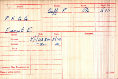 Ernest Edgar Pegg was born in Saxon Street in 1891 (Newmarket Q4-1891 3B:517), son of Edgar and Jane Maria PEGG (née WOOLLARD).