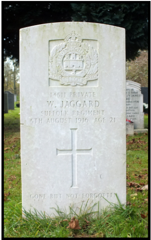 William Elisha James Jaggard was born at Gypsy Hall, Dullingham Ley (Newmarket Q1-1895 3B:525) baptised in Burrough Green on 11th August 1895, son