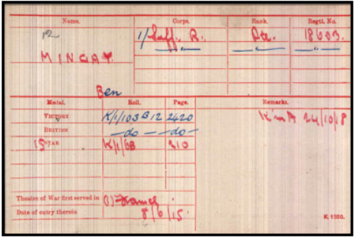 No registration of a marriage between MINGAY or MINGEY and CLAYDON has been found within the time scale, the name change seems to have taken place between the 1891 and 1901 census. Ben fought and died as MINGAY