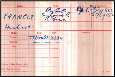 Herbert Francis was born in Hoddesdon, Hertfordshire (Ware Q4 1878 3A:303), son of Edward Spencer and Mary Ellen FRANCIS (née HANDSCOMB).