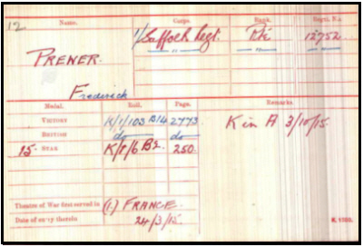 Frederick Francis Prewer was born in Exning (Newmarket Q2-1897 3b:509], the 2nd son of George and Sarah PREWER (née CLAYDON) of 3 Eleanor Terrace, Exning.