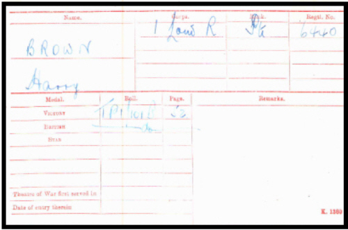 Harry Brown is commemorated on the Thiepval Memorial, France. pier and face 9D-16B-