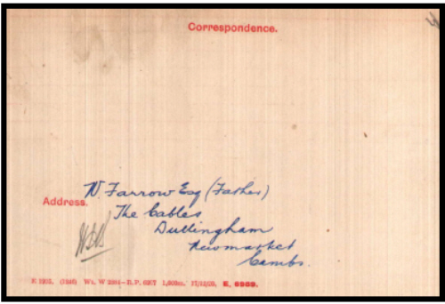 1901 census...Aged 3, he was at 68 Langler Road, Willesden, with his father Martin W FARROW [30] ladies tailor, born Wickhambrook; his mother Mary J W [38] born Sheerness, Kent and his sister Kathleen W [6 months] born Kensal Green, London. 1911 census...Aged 13, he was at boarding school, Xaverian Brothers School, Pennybridge Mayfield (Sussex). His parents were at Cables Farm, Dullingham (father now a ladies tailor/farmer) with his sisters Kathleen and Eileen [3] and brothers John [7], Bernard [5] and Leonard [1]. All the new siblings were born in Brondesbury, London. |