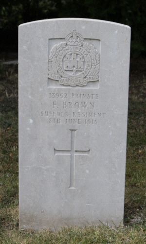 Born Q2-1877,[Newmarket 3b:573] in Snailwell, Cambs, the son of Thomas and Mary BROWN (née NIGHTINGALE), of Fordham Road, Exning. 1881 census...at Fordham Road, Exning were Frederick George [4]...his father Thomas [41] an agricultural labourer, born Snailwell...his mother Mary [41] born Coton....his sister Ellen F. [10], born Exning...brother Thomas C [6], born Snailwell...sister Maud M [5], born Snailwell. 1891 census...still at Fordham Road, Exning are Frederick, now an agricultural labourer, his parents, brother Thomas, sister Maud and brother Albert [8] born Exning. 1901 census...at 3 York Cottages, Exning were Frederick now a drainage navvy, his father was now horse keeper on a farm, his mother and sister Maud, who were laundresses,and brother Albert who was a carter on a farm 1911 census...still at York Cottages were Fredrick George (now a domestic gardener), his father ( now a cow man) and mother and brother Albert (now a horse keeper) The 1891 census has his age as 4, but the other census have his year of birth between 1877 and 1882. Confusingly, most of the family became several years younger in the 1911 census and the marriage was shortened by 10 years. He enlisted in Newmarket and was a younger brother of Thomas BROWN As he never entered a war zone he was not eligible for any medals Frederick's entry in "Our Exning Heroes" reads as follows: Brown, F. 3rd Suffolks Frederick Brown joined up in September, 1914, and was sent to Colchester for his training. Owing to illness he was unable to go out to the war, and he died of consumption on June 8th, 1915, at the age of 33 (sic). He was buried at Exning, and given a military funeral, all the arrangements for which were made by Mr. George Townsend. The firing party was under the command of Sergeant Bunker, of the Bedfordshire Regiment, at that time stationed at Newmarket. Before the war he was a gardener and worked for Mr. Cossens of Newmarket. He was a good long-distance runner, and ran at various shows at Exning, Stetchworth and Newmarket, carrying off several prizes. The Newmarket Journal of 19th June 1915 reported:- MILITARY FUNERAL "Pte Frederick George Brown, of the 8th Suffolk Regiment, died in hospital at Colchester on the 9th (sic) instant, after an illness which had lasted some little time.Private Brown, who was the son of Mr. Thomas Brown of York Terrace, Exning, was, previous to the war,in the employ of Mr. Philip Cosens, at Warren Lodge, Newmarket, as an under-gardener. A brother, Thomas Brown, who had previously been in the Army and re-enlisted at the outbreak of the war, has been serving at the Front and was recently reported "missing". The deceased was interred at Exning on Monday afternoon with all honours due to a soldier who has died while serving his King and Country. The cortege was headed by a firing party (13 in number) of the 2/5 Bedford Regiment, under Sergt. Major Bunker, marching slowly with arms reversed. Next came the band of the Northampton's under Band Sergt.Whitsey and Sergt.Drummer Allen. The drums were draped in black. The coffin, covered with the Union Jack, and with beautiful floral tributes, was in an open hearse....." Brother Thomas, mentioned above, was later reported as dying exactly one month earlier than Frederick. |