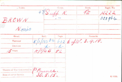 Born in Swaffham, Cambs in Q3-1890 [Newmarket 3b:496], the son of Thomas and Sophia BROWN (née FRYETT), of Gutter Lane, Swaffham Bulbeck, Cambs 1891 census...at Gutter Lane, Swaffham Bulbeck were Benjamin M (?) [7 months]...his father Thomas [23] an agricultural labourer, born Holton, Norfolk, and his mother Sophia [25], born Isleham. 1901 census...at 1 Morbeys Cottages,Laceys Lane, Exning were Noris [10] and his parents and a visitor. 1911 census...at Morbey Cottages, Laceys Lane, Exning were Norris [20] an agricultural labourer, his father, mother and a cousin He enlisted in Newmarket as # 12222, Suffolk Regiment. Norris's entry in "Our Exning Heroes" reads as follows: Brown, N. 15th Suffolks, Lance Corporal Norris Brown, the only child of Mr. And Mrs Brown of Morley's Cottages, joined up during the first month of the war, and received his training at Shorncliffe. After about nine months' training he went out to France and was twice wounded, though not seriously. The second time he was sent home to England, and after he had recovered went to Egypt, where he remained for fifteen months.he returned to France in May, 1918 and on September 2nd was very dangerously wounded and died the following day. The Sister in charge of the clearing station writes: "Both legs were blown off, and his condition from the beginning was quite hopeless. He was conscious almost to the end, but did not suffer any pain. He was buried at Dernancourt, one and three-quarter miles S.S.W. of Albert." He was 28 when he died. Before the war he worked on the Heath for the Jockey Club along the Bury Road. He was specially good at football and played cricket as well. |