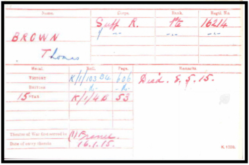 Born Q3-1874,[Newmarket 3b:521], baptised 3rd December 1876 in Snailwell, Cambs, the son of Thomas and Mary BROWN (née NIGHTINGALE), of Fordham Road, Exning. 1881 census...at Fordham Road, Exning were Thomas C [6]...his father Thomas [41] an agricultural labourer, born Snailwell...his mother Mary [41] born Coton ....his sister Ellen F. [10], born Exning...brother Frederick G [4], born Snailwell...sister Maud M [5], born Snailwell. 1891 census...at Fordham Road, Exning were Thomas [16] an agricultural labourer..his parents, younger brother Frederick, sister Maud and brother Albert [8], born Exning. 1901 census...at 3 York Cottages, Exning were his father, now horse keeper on a farm, his mother and sister Maud, who were laundresses,and brothers Frederick now a drainage navvy and Albert who was a carter on a farm. Thomas is presumably away in the Army, either in India or South Africa. 1911 census...Thomas yet to be found in a census, but he was probably still in the Army. His service records for this period have not been found He had served in the Boer War, having been in India when that war broke out. He enlisted in Newmarket. His sister Maud (TAYLOR) of 10 Eleanor Terrace, Exning appears to have completed the CWGC forms, his parents having died The pension form initially gave his dependant as Ethel Sarah ASHBY, 2 Heath Cottages, Exning, guardian of illegitimate child, Georgina May ASHBY ( 1915 qtr 2 NEWMARKET 3b:803). Ethel was replaced by Mrs Harriett ASHBY (Ethel's mother), He was the elder brother of Frederick BROWN Thomas' entry in "Our Exning Heroes" reads as follows: Brown, T. 1st Suffolks Thomas Brown, an elder brother of Fred, had served in the South African War, and was in India when that war broke out. He won one medal. At the outbreak of the war with Germany he rejoined the Army at once, and was sent to France in the following January. He was killed on May 8th, 1915, at Hill 60, his death being instantaneous. Nearly all his Regiment were killed at that time, only eight coming out alive. He was 38 (sic) when he died. He was a bricklayer by trade, and worked at Mr Hunt's, builder, Newmarket. A report in the Newmarket Journal of 29th January 1916:- DIED FOR HIS COUNTRY - Mr. Thomas Brown, Burwell Road, has just received an official intimation from the War Office that the death is presumed of his son Pte. Tom Brown, Suffolk Regt, who has been missing since May 8th. Pte. Brown served in the Suffolks for twelve years, and rejoined his old regiment after the war broke out. Previously he was employed by Mr. E.H.Leach at Hamilton Stud. Another soldier son of Mr. Brown's died in May last and was buried at Exning. |