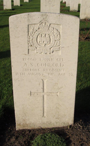 The Newmarket Journal of 4th September 1915 reported:- DEATH OF AN EXNING SOLDIER AT THE FRONT - Mr.G.Cobbold, painter, of Lacey's Lane, has received word that his son, Lce-Corpl. Alfred Cobbold, had been killed at the front. He was engaged in fixing wire entanglements in front of the German trenches, a work he had volunteered to do, when he met his death. His mother received the following letter from the Chaplain of his Brigade. "Dear Madam, I regret to have to inform you that Lance Corporal A.Cobbold, 12460, 7th Suffolks, has been killed in action. I buried him today, and his comrades are placing a cross above his grave. Please accept my sincere sympathy in your loss, and, believe me, yours faithfully..F Lowland Ryan, Chaplain to the Forces, 35th Light Infantry Brigade, 12 Division, August 18th, 1915". Mr. Cobbold also received a letter from his son Ernest, who is in the same brigade, with reference to the death of his brother, in which he says:- "I am writing to you dad, instead of mother, as I thought you would be better able to bear it than mother. Well, I am sorry to tell you that poor Alf is gone. I was much cut up about it, but saw him before he was buried and went to the funeral. It happened on Wednesday, August 18th 1915. I saw him and spoke to him about 1 1/2 hours before it happened. It was a shell. I cannot write more about it now, as it makes me feel so bad. I do hope you will not take it to heart too much. I am worrying most about mother, as I know she will feel it very badly". Mr. Cobbold's other son, George was in the Royal Fusiliers but was discharged because of illness.Mr. Cobbold himself is in the Newmarket and District Volunteer Training Corps. The greatest sympathy will be felt for Mr. and Mrs Cobbold in their sorrow. Lance Corpl Cobbold was in the service of Lord Durham, being employed in the Harraton House gardens before he enlisted." Also in the Journal:- LANCE-CORPL. COBBOLD'S DEATH- Pte.B. Ashby, of the 7th Batt. Suffolk Regiment, gives, in a letter which has just been received by Mr. and Mrs George Cobbold, the following account of the death of their son, Lce-Corpl Alfred Cobbold, in action: "Just a few lines to let you know, how the platoon is cut up, of the loss of my pal Alf, who was killed in action on the 18th August. I do miss him. We had been together ever since we enlisted, which was at the outbreak of the war. I was with him at 8 o'clock the morning this happened, but he did not suffer much pain - he only called out "Sergt Hardy" two or three times. Sgt Hardy came to his assistance the moment the shell had exploded. With Alf on his knees, another private in his arms and another on his legs he did all he possibly could for them. There were several more cut about something shocking at the time. I can honestly say there was not a nicer and better chap than Alf.He was liked by every chap of his platoon. Well,Mr. and Mrs Cobbold and family, the sergeant and the platoon all send their deepest sympathy in your sad bereavement". - Mr. andMrs George Cobbold, wish, through the JOURNAL, to thank the people of Exning for the greatest sympathy shown to them in the loss of their son, who was killed in action on August 18th." |