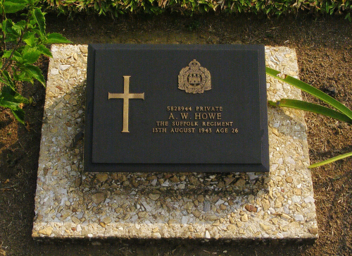 Born 4th June 1917 in Exning [Newmarket 3b:688], the son of Arthur J. and Ada Ethel HOWE (née CHALLICE). He never knew his father Arthur James Charles HOWE who was killed in France on 22nd November, 1917. His mother married Thomas AKERMAN in 1921. in the 1939 register, at 4 Burwell Road, Exning were Arthur; his stepfather Thomas H AKERMAN [17-2-1891] racehorse studman; his mother Ada E [29-1-1897]; half brother Frederick J AKERMAN [23-5-1924] baker's roundsman assistant. There are 2 closed records. Arthur William was a racehorse studman, living with his mother at 4 Durham Cottages, Exning (from his Japanese PoW card). |