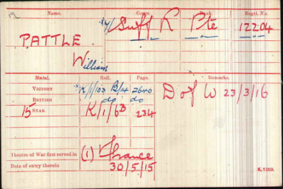 The 7th Suffolks were just north of Loos that week, having just taken over Northampton Trench from the 5th Royal Bucks at 2:30 pm, on 22nd, between Auchy-les-Mines and Vermelles. On 22nd, around 8:30 pm a mine exploded to the left of our front and provoked heavy machine gun fire. The next day the German artillery shelled Northampton Trench with 77s and in the afternoon, shelled Sticky Trench with heavy High Explosive. Our artillery retaliated on St. Elie and their shelling stopped. The Suffolks appear to have been 'enjoying' a quiet spell as they only had 4 deaths the whole week. Whether it was shell or a sniper that wounded William is not known. William's entry in "Our Exning Heroes" reads as follows: Pattle, W. 7th Suffolks William Pattle living with his parents at Vine Terrace joined up at the commencement of the war. He had his training at Shorncliffe and went out to France in May of the following year. He was very severely wounded in the head on March 22nd, 1916, and died the next day. His mother died of consumption about a month before, and he obtained leave to come home and remain here till after the funeral. After leaving school he worked first on the land and subsequently for Mr. Norman at the Laundry. He was only 21 when he was killed. |