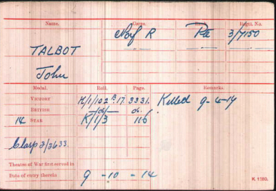 His civilian identity is not absolutely sure but assumed to be: John TALBOT was born in Exning , his birth registration has not been identified, son of Robert and Rhoda TALBOT (née HEFFER). "Soldiers Died" says he was born in Exning (John Talbot) Military records indicate an 1893 birth, civil records point to 1895 (there was a John HEFFER birth registered in 1895). 1901 census...He has not been found in this census. His father Robert appears to have died in 1898. His mother ? Rhoda (widow) was a servant in Cherry Hinton. Brother Robert has not been found. 1911 census...In the 1911 John, 16, a farm labourer born Exning and a boarder with Walter and Lydia COLLEN (née BROWN) at East Fen Common, Soham. He gave Walter as his master in enlistment as Walter Collen, East Fen, Soham. At the 1911 census Walter was stated to be permanently incapacitated so a 16 year old helper would have been very useful. Later John gave Lydia COLLEN's name as next of kin and foster mother. It seems his mother Rhoda (widow) was in the Workhouse, Exning Road, Newmarket The Army family form signed by Lydia COLLEN states he and brother Robert were raised in the workhouse then she adopted John 'Jack' TALBOT. He then went to Norwich and on 9th December 1911, enlisted in the Norfolk Regiment. He was aged 18, 5' 4.5" (163.8 cm) tall and weighed 112 lbs (51 kg). He had worked for William POLLARD of Brook Street, Soham Some of his military training must have taken place at Shornecliffe Camp near Folkestone, since he got 2 day confined to barracks on 2nd May 1912 for " being careless on the rifle range". He was based in UK until 6th October 1914, then went via St Nazaire to France, joining his battalion on 15th October 1914, thus earning the clasp to the 1914 star. Wounded on 26th April 1915 he came back to UK on 29th, remaining here until 4th October 1915. He had two periods of illness, from 28th February to 5th March 1916, and from 31st May to 6th June 1916. Apart from his 2 days CB at Shornecliife and another 3 days CB in September 1914 for being late on parade at Walton, near Felixstowe, he appears to have had a blameless military career, even a blank "drunkeness" sheet. He was killed on 9th April 1917 at the start of the 3rd battle of Arras and initially buried at Estaminet Corner, and later interred in his final resting place at Bunyans Cemetery. His elder brother Robert ( born 3rd December 1891) also has many sheets of his records in the "burnt" records and survived the war, being the eventual recipient of John's effects and medals. The Army at that time had Robert living c/o Mrs E PALMER, Newnham, Burwell. Robert gave his next of kin as his Aunt Mrs J St.... (here, annoyingly, the records are illegible but it could be Stubbings). Robert served in the Cambridgeshire, the Royal Sussex and the Suffolk Regiments. Both brothers appear to have added to their age for the Army. Currently despite have quite extensive military records, it is proving difficult to find records of their mother and father, except John stated in 1911 that his father was dead. The evidence is of his mother being Rhoda HEFFER, an Exning girl who married Robert TALBOT in Q3-1891 and that Robert senior was the Robert Talbot who died in Q1- 1898. As to mother, a Rhoda TALBOT died (reg Newmarket q2-1923) but the two boys did not give her as next of kin. In the 1911 census it seems Robert Talbot junior was in Exning at White Hall Yard with his uncle and aunt Arthur and Fanny TALBOT. |
