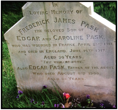 Frederick James Pask was born in Fornham All Saints (Thingoe Q1-1887 4A:692), son of Edgar and Caroline Kate PASK (née SHARPE ).