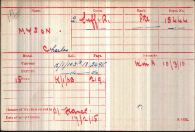 Born in Kentford, Percy Charles MYSON, birth registered in Mildenhall Q4-1891 [Mildenhall 4a:750]. Son of Eli and Mary MYSON (née GOODCHILD), living in Worlington Road, Kentford.