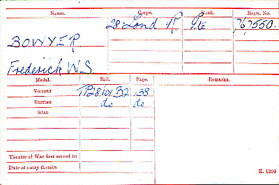 1901 census...Aged 2, he was at Place Farm, Kirtling, with his father Frank BOWYER [36] farmer, born Finchingfield, Essex; his mother Rose Alice [25], born Elsenham, Essex and sister Queenie Francis [3] born Hundon. 1911 census...Aged 12 he was at Place Farm with his parents, sister Queenie and brother Frank Mascall [2] born Kirtling. His brother Kenneth George was born later in 1911 in Kirtling. No pension card has been found |