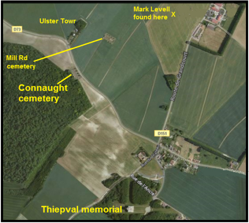He enlisted in Kirtling. It was just four days after Thiepval was finally taken by the Allies. The 8th East Surreys were tasked with taking the Schwaben Redoubt, this despite being low on numbers. There is a mass of information, far too much for here, on here , the East Surrey war diaries are most comprehensive. 48 of the 69 men of the 8th East Surreys who died that day have no known grave. Mark Levell was found with 2 chums (1 unidentified) and re-interred in Connaught Cemnetery in 1919 |