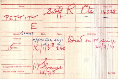 1901 census...Aged 4, he was at Torment Cottages, Kirtling with his father Edward PETTITT [42] horseman on farm; his mother Sarah [40], sisters Florence L.[7] and Emma E. [2] and his grandfather James PURKISS [78] retired farm worker. All were born in Kirtling. 1911 census...Aged 14, farm labourer, he was still at Torment Cottages, Kirtling with his parents (father now recorded as James Edward Pettitt), sisters Florence Louise, Emma Ethel and Martha Gladys [9]. Now all the records show Upend, Kirtling. Torment Cottage appears to be in Upend in other records, including the pension card. |