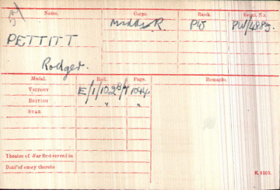 1891 census...Aged 2, he was at Cottage, The Green, Kirtling with his father George PETTITT [45] general labourer; mother Ruth [51]; sisters Margaret [19], Alice [8] and Salome [7] and brothers Alfred [13] farm labourer, and Francis [5]. All the family were born in Kirtling. There were other siblings, Sarah born 1866, Elizabeth [1867] George [1869], William [1871] and Ada [1874]. 1901 census...Aged 12, he was at Cottage, The Green, Kirtling with his widowed mother Ruth PETTITT [56] a pauper, born Kirtling; his sisters Alice [19] and Salome [16] and brother Roger [15] (farm labourer. All the children were born in Kirtling. His father had died in 1895. 1911 census...Aged 22, a milkman on farm, he was still at the Green, Kirtling with his mother, sister Alice and brother Francis (farm labourer). His mother had borne 10 children and all survived according to the 1911 census but there was apparently one "forgotten" child as previous census make it 11 children. Throughout the census there are serious discrepancies in the ages of his parents, sometimes his father is older than his mother, other times younger The pension card has his mother at Charing Cross,Kirtling His brother Francis was died of his wounds in Glasgow in 1917 see here . |