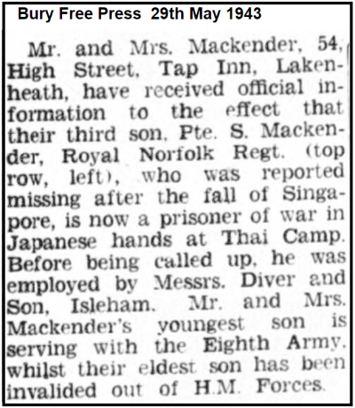 Born in Lakenheath on 24th May 1915 (Mildenhall Q2-1915 4A:1775), son of Robert Cooper and Ella Maud MACKENDER (née KENT). His will gave his address as The Tap, High Street, Lakenheath and his father as publican In the 1939 register he was a general labourer, living at The Tap Inn, High Street, Mildenhall with his father Robert [8-3-1889] a labourer/innkeeper; his mother Ella M [10-3-1893]; brother Reginald S [19-4-1913] farm labourer; sister Marjorie E (later Mrs FLACK) [3-9-1928] scholar. His younger brother Ronald died in Italy :- see here |