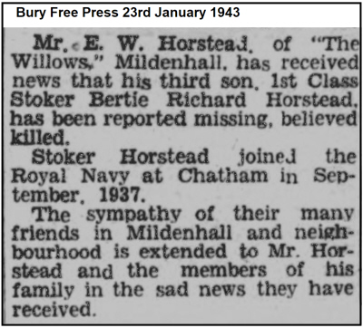 In the 1939 register, at The Willows, St Andrew's Street, Mildenhall were his father Ernest W HORSTEAD [12-12-1880]builder; mother Florence M [9-5-1890]; uncle Harry S ROBERTS[ 16-5-1894] a miller's packer; sisters Eunice [2-4-1916]later PINE, grocer's assistant and Irene S [6-8-1926] later SHERRY. There are 2 closed records. |