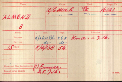 Bertie ALMOND was born Q1-1894 [Newmarket 3b:520] in Newmarket to Mark and Ellen Maria ALMOND (née TAYLOR). 1901 census...At Myrtle Cottages, Exeter Road, Newmarket were Bertie [7] with his father Mark [39], a stableman, born Darwen, Lancs; his mother Ellen [37] born Chippenham, Cambs; brother George [18] a groom, and sisters Cissy [17]; Kate [15]; Daisy [11]; Maud [9] and Olive [3] and a lodger. All the children were born in Newmarket. 1911 census...At Rupert Cottage, High Street, Newmarket, were Bertie [17] a cellarman; his parents; sisters Daisy [21] a telephone operator; Maude 17],a dressmaker; Olive [11], and new brother, Sidney [10] born Newmarket The pension card has the family still at Rupert House at least until 1919. |