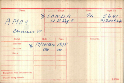 Newmarket. Brother of Frank AMOS. 1881 census...At 3 Flint Cottages, Granby Street,Newmarket were Charles W [2]; his father John F [38], a railway porter born in Pattiswick, Essex; his mother Ellen [37], born Pattiswick; sisters Emma [16], born Pattiswick; Louisa [9], born Woodditton; Alice N [4 months], born Woodditton, and his brother John. F [6] born in Woodditton. 1891 census...At Flint Cottages, Granby Street were Charles; his parents; brother John, now a railway porter; sisters Alice [9] and Nelly [5] and brother Cecil [1], all born in Newmarket 1901 census...In Granby Street, Newmarket were Charles [22], a postman; his parents; sisters Louisa, now a servant, Alice and Nellie, both dressmakers, and brother Cecil [11], still at school. 1911 census...At 24 Granby Street were Charles, his widowed mother and sister Nelly. His father died in 1907 All the children, except Alice, were born in Newmarket. The confusion as to place of birth centres on Woodditton being at times recorded as a parish of Newmarket as well as the village. The pension card has his dependant as sister Nellie Amos at 26 Granby Street, Newmarket. As he died from wounds and yet has no known grave it seems his original grave was destroyed in later fighting. |