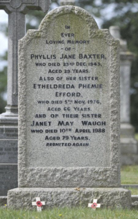 Born in Q3-1913 [Newmarket 3b:859], daughter of Charles and Jennie WAUGH (née EDWARDS) of Carlburg, Bury Road, Newmarket. She married Alexander Ralph BAXTER in Calder, Yorkshire in the 3rd quarter of 1940. Alexander was an Army corporal, serving overseas when Phyllis died.