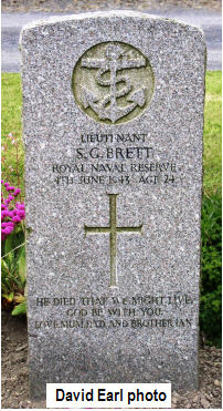 | This man has not been positively identified with Newmarket connections apart from the CWGC entry which has his parents as of Newmarket. He maybe should not be included Stanley was the son of George Henry and Margaret Ethel BRETT (née WOODS ?) of Newmarket. In his will his address was given as Rugby Road, Dunchurch, Warks. His birth registration is not positively identified but believed to be Dec 1920 Ipswich 4A:1850. http://www.unithistories.com/officers/RNVR_officersB2.html#Brett has his mother born 1893, his brother Ian as born 29-9-1924 in Dunchurch but that registration cannot be found. In fact taking the family as father, mother and two brothers, no records concur, no marriage registration, all rather nebulous. It seems to be his parents George H BRETT [6-5-1890] chauffeur to Major Cayzor (High Sheriff of Warks and Master of the Pytchley Hunt), and Margaret E [11-12-1891] at Lodge Gate, Rugby Road, Dunchurch, Warks in the 1939 register. How long the family were in Newmarket has not been established, which may be why Stanley was not included on the war memorial. His brother Ian was also a Fleet Air Arm Lieutenant, who survived the war. There is a possible birth registration at Alvie in Scotland |