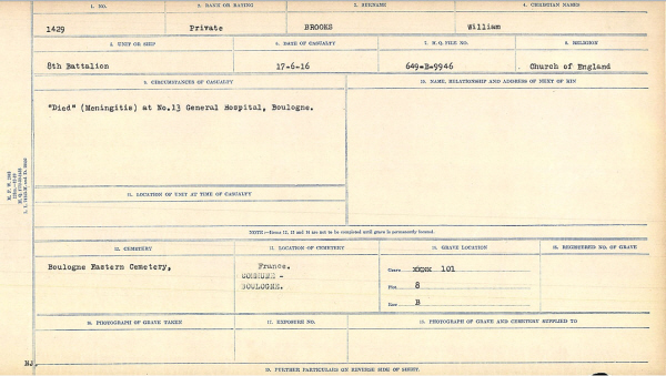 Labourer by trade. National Archives of Canada Ref:RG150, accession 1992-93/166, Box 1109-20 He was 5 feet 9 inches (175.3 cm) tall, chest 34" to 37" (86.4 to 94 cm), blue eyes, black hair, Church of England. He arrived in France on 12th February 1915 and joined 8th Battalion in the field. Admitted to 2 Canadian Field Ambulance with influenza on 7th March 1916, rejoining unit on 12th March. On 8th June 1916 he suffered concussion and shell shock and was admitted to 17 Casualty Clearing Station, 14th June 1916, then admitted to 13th General Hospital, Boulogne - N.Y.D. (Not Yet Diagnosed) on 16th June 1916. William died of meningitis at Boulogne, No.13 General Hospital |