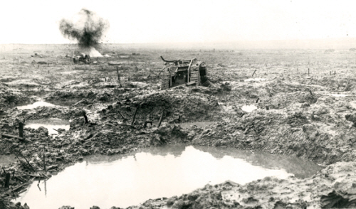 was pock-marked with shell-holes, so full of water that men often had to struggle to prevent themselves from drowning. The valleys of the streams were
