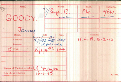 over 400 casualties. On 18th February 1915 the 1st Suffolks, who had been alternatively holding water filled trenches or trying to capture 'O' trench, just south of Ypres, were relieved and went to billets in Kruistraat. The reason for 28 to be listed as killed on 18th would have been when the roll was called, some of these were those later presumed dead. Of the 28 only 2 have known graves. |