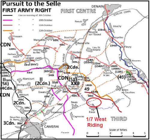1918, 2 days after arriving in France. The Pursuit to the Selle was an advance in the Cambrai region which sustained quite heavy casualties, including "shorts" from Allied artillery. The West Riding battalions were part of 49th Division on the right flank of the Canadians. The battalion war diary has :- " Escadquires area - 11-10-18- Operations Orders received for attack. Bn moved forward 2 am to assembly positions east of NAVES and NW of RIEUX. In position 5 am. BHQ established in NAVES. Right Bn of right Bde on 2nd Bde front. Zero hour 9 am. An advance of 1,000 yards was made, the Bn passing through the Canadians, who were holding line. Towards noon the enemy counter attacked with tanks and we withdrew 500 yds to SUNKEN ROAD running thro U.14.b.; U.8.d. (sheet 51a) where enemy were held for the night. The Bn then became Bde Reserve." The history of the 1st/7th Battalion has more detail, the German tanks actually numbered eight, coming on from Avesnes-le-Sec. When the battalion eventually withdrew almost back to their start line, they became mixed up with the 6th and 4th battalion but luckily the tanks did not cross the crest of the ridge. A second advance, albeit with heavy casualties eventually took the ridge. His battalion had 59 killed that day, all bar 6 are buried in Wellington Cemetery, Rieux-en Cambresis. The total dead for all battalions of the West Riding Regiment on the 11th November was 140. The cemetery was made by the Duke of Wellington's West Riding battalions immediately afterwards, hence the name. It was enlarged later by concentrations from the area nearby, mainly south of Rieux. |