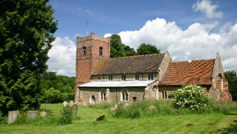 Peter is buried in St Margaret's Churchyard in Cowlinge, with church to left, cross church yard to far side, under tree by fence