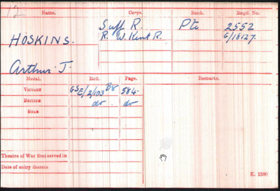 5' 3 3/4" (161.9 cm)tall, weighing 108 lbs (49.1 kg). His father and 3 sisters were then living at 75 Bridge Road, Battersea. Arrived with Battalion in Boulogne on 27th August 1916, posted to 1st/4th Suffolk Regiment but transferred to 7th Battalion (Queen's Own) Royal West Kent Regiment on 7th September 1916. He was wounded in the field (GSW= =gunshot wounds, to thigh and neck) on 27th September. The Royal West Kents ( 18th (Eastern) Division, 55th Brigade at 2pm on 26th September moved up to Crucifix Corner and nearer to Thiepval by 8.30am the next morning. They were heavily shelled during this period.They were being held ready for another assault on the Schwaben Redoubt. The 7th lost 20 men killed on the 27th, half of which actually have identified graves. Arthur was eventually passed back along the lines and ended up at No 13 General Hospital by 12th October. It is recorded that visits were permitted, following the usual procedure, at public expense and arrangements were made and travel warrants issued for his father and sister to travel to see him, but it is not clear whether they actually travelled in time to see him before he died on 17th. A great deal of his records still remain, but mostly concerned with his sister trying to get his medals (his father had died in 1919). His sister Mrs Lilian Ann MALINS was concerned that by 1921 the family still had not got the medals. Some of the delay was due to their father dying and her establishing herself as next of kin. She informed the Army that Arthur had left no will as he had nothing to leave |