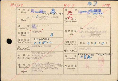 His Japanese PoW card gives his occupation as Retailing Tradesman, his mother as Margaret Kirkpatrick of 10 Field Terrace Road, Newmarket.