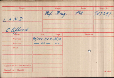 1901 census...Clifford [6] was at 3 Bellbrooke Street, Potter Newton, Leeds with his father William C.[45], an upholsterer; his mother [43] and sisters Minnie [17]; Amy [15]; Elsie [11] and brothers Alfred [20] a paper makers clerk, and Claude [9]. All were born in Leeds. 1911 census...Clifford [16] a butchers apprentice was at 16 Craven Terrace, Leeds with his parents and sisters Amy and Elsie. One of the 7 children had died. He is recorded as living and enlisting in Newmarket but no details have been found. |