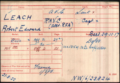 He enlisted in Newmarket. Dying of his wounds makes it difficult to locate where and when he was wounded, until such time as his army records may be found at Kew. The date and cemetery indicate he was involved in some phase of the 3rd Battle of Ypres 64th Brigade R.F.A. war diary was not found, but thanks to Nick Miller, amongst his grandfather's belonging was the page required. The Brigade war diary has:- 29th Nov.- Weather fair. Batteries took up about 700 rds of ammunition each. The enemy shelled wagon lines and Vlamertinghe area all the afternoon and during the night. Capt.Leach A.V.C. and 2nd Lieut Mculloch A/64 were wounded and several ..?.. and about 10 horses were killed. Capt.Leach died at No.24 Field Ambulance. On the 29th November 2015 he was subject of one reading at the Menin Gate, Ypres. His service record has not yet been found at the National Archives |