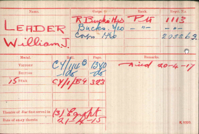 1901 census...William John LEADER [9] was at Barcelona House, Wroughton, Wiltshire with his widower father William [45], racehorse trainer, born Wroughton; his sisters Annie [20] born Dumfrieshire; Rose [18] born Wroughton; Beatrice Jean [14] born Wroughton; Nest [12] and Elsie [10] both born Wroughton and his brother Reginald [3] also born in Wroughton. His mother had died in 1899. 1911 census...His father died in Newmarket in 1909, his younger brother Reginald was a boarder at school in Soham and two sisters were working away, no sign of John. CWGC used Jack as his first name, his medal card has him as William J. and he is John on the war memorial |