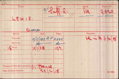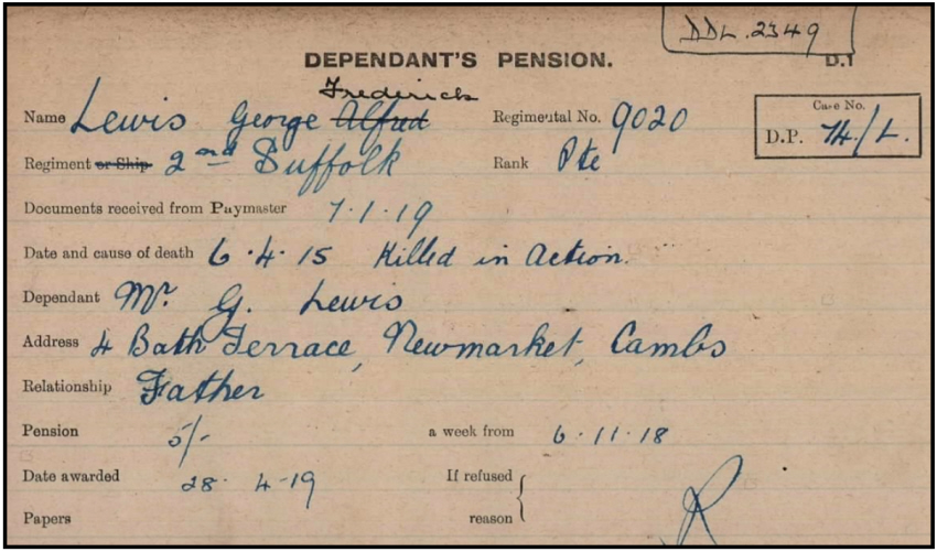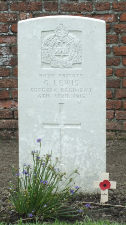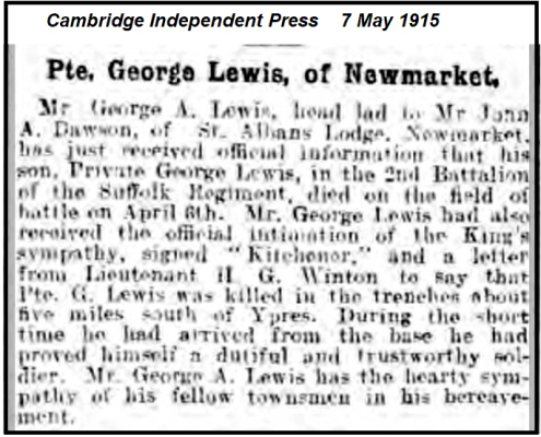 The Newmarket Journal of 1st May 1915 reported George's death and gave him as the son of George LEWIS, head lad to John Dawson, of St Albans Cottage, Fordham Road, Newmarket "Soldiers Died" also has him as born in Newmarket (no such registration has been found) and his Personal Effects entry has father as George Alfred Lewis. The Cambridge Independent Press on 7th May 1915 also recorded his death. It seems from all the documents found that he was George Frederick LEWIS, born on 10th May 1890 in Stoke by Clare (Risbridge qtr 2 4a:651) the son of George Albert and Grace Charlotte LEWIS (née HEAVENS). His father first came to Newmarket to be a stableboy at Heath House for Matthew DAWSON). He was baptised in St.John the Baptist, Stoke by Clare on 5th June 1890, his father's occupation given as "trainer". 1891 census...None of the family found in this census. 1901 census...His family were at Cheveley Road, Newmarket. His father was head lad in racing stable, aged 31, born in Cardiff. His mother was 29, born Newmarket. also there were his siblings, all Newmarket or Exning born: sisters Dorothy Grace [9],Violet [4] and Daisy [2]; brother William [7]. 1911 census...Aged 20, he was an engine cleaner, boarding with the BLAKE family at 9A Tyler Street, Parkeston Essex. His parents were at Field Terrace Road, Newmarket with his siblings; Dorothy, Violet, Daisy, Freda [5] and Thora [2], brother Jackie [9]. His mother had borne 14 children but had lost 5. His mother died in 1912 George has so far not been identified in any other census. |