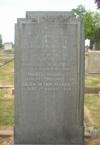 Captain Marriott, usually known as "Dan", was involved in the taking of Water Tower Hill in Singapore on 13th February 1942. "Battalion at War" by Michael Moore, regarding 'Reinforcement' Company, recounts that:- "Capt Marriott led his men into the valley, while "D" Company laid on supporting fire with Brens and mortars, the Japanese swept the southern slopes of the hill with heavy machine gun fire,but despite appalling casualties the 'Reinforcement' Company pressed home its attack. ... Capt Marriott was seen to fall wounded when only half way up the hill, but he picked himself up and waved his men on. Capt. Marriott urged his men forward and personally led a charge towards an enemy machine gun post, which he attacked with grenades. Again he fell, shot through the body by a burst of machine gun fire, but his brave action gave his men encouragement to continue the assault. Lt Orton Taylor (also from Newmarket) immediately took command and led the attack towards the summit. Capt Marriott survived, to be taken prisoner, and was later to die in Roberts Hospital, Changi. Buried in Changi Cemetery, he was moved to Kranji on 21st April 1946. |