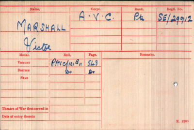 Born Victor Marshall STRUGGLES in Marylebone, London ( Marylebone Q2-1886 1A:635) (according to enlistment documents it was 1885), son of Lizzie STRUGGLES His mother married Albert Victor MARSHALL in Marylebone in Q3-1886 1891 census...Now Victor MARSHALL [4] at 389 Harrow Road, Paddington, recorded as born St John's Wood,(step)son of Albert V. MARSHALL [27] a drapers assistant born Bayswater, and Lizzie A [27] (née STRUGGLES),born St John's Wood with another son Edward A [3] born Kensal Green and a daughter Elizabeth M [2] also born Kensal Green. His (step) father died in 1897 in Paddington 1901 census...Aged 14, he and brother Edward were boarders with John and Ellen MEAD and their family at Stewkley, Bucks. September 1910, in Newmarket, he married Daisy Ethel RAWLINSON. He gave his age as 21 and his father, the late Albert Edward Marshall. 1911 census...Now recorded as Esher MARSHALL [21] born in Willesden, he was a stableman, with his wife Daisy Ethel[20] and daughter Mabel Ida [4 months) ( born Newmarket) living with his mother in law, widow Ellen Jessie RAWLINSON, at Icewell Hill, Newmarket. How he came to use the name Esher is a puzzle to the family even. By the time he enlisted, Victor lived at 1 Plympton Cottages, Exeter Road, Newmarket. He was married to Daisy Ethel MARSHALL (nee RAWLINSON) on 19th July 1910 in Newmarket, and they had 3 children that survived. Daisy gave birth prematurely to a baby girl the day after the Zeppelin bombing in Newmarket on 12th January 1916, and died herself a day later. Victor had been working for Reg Day, trainer, The Terrace, Newmarket. He had three surviving children, Mabel Ida (27/11/1910), Sidney Victor (27/4/1912) and Albert Edward (10/6/1914). |