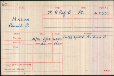He enlisted in Newmarket 2/15th (County of London) Battalion (Prince of Wales's Own Civil Service Rifles) were formed at Somerset House in September 1914. They went to France in June 1918 and became part of 90th Brigade in 30th Division. A fresh offensive was begun on the 14th from Dixmude to Comines, and within a few days the Allies had taken Courtrai, Roulers and Ostend. from the war diary: It was announced on the 13th that a full attack was to be made the following morning. The London Scottish were to be in the centre, the Civil Service Rifles were to assault on the right, with the 7th Cheshires on their left. London Scottish were to mop up in support of the advancing companies. The objective was the Menin-Wervicq Road some 2,400 yards ahead. A creeping barrage was to begin 300 yards ahead and lift 100 yards every 90 seconds. At the fifteenth lift the barrage was to remain stationary for 15 minutes to enable consolidation then it would continue until it was 200 yards ahead of the objective. Machine guns would provide overhead fire and the heavy artillery would engage targets in the rear. This tactic was proving to be very successful by this stage of the war. The attack was scheduled for 5.35 am and the men were moved up at 4am and all was reported ready. At 4.10 the men moved up to the jump off line which had been marked out with crossed tapes by the Royal Engineers the night before. At 5.35am hundreds of shells passed overhead and the men moved forward. The rain stopped and with 5 percent of the shells being smoke, the men were offered some protection as they moved forward. The German outposts capitulated at once but machine guns positioned behind them showed more fight and serious casualties began to be taken. The wire was sporadic causing some pausing in the advance. On reaching a wooded area they encountered some pillboxes some of which surrendered at once, others held out. Six of Basil's battalion were killed, all bar one buried in Somer Farm Cemetery. |