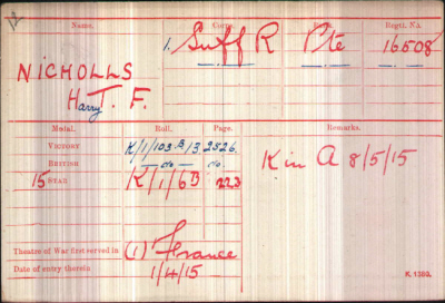 Born in Q1-1895 in Newmarket [Newmarket 3b:542], registered as Henry Thomas Frederick NICHOLLS, 2nd son of George William and Rose NICHOLLS (believed to be