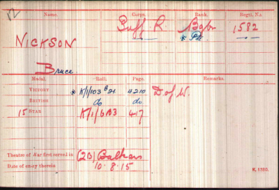 1901 census...Bruce [2] was at Stanley Road, Newmarket with his father Leonard R [32] a plumber, born Plymouth; his mother Rose [33] born Cambridge; his sisters Rose [8] born Soham and Lily [7] born Newmarket, and brothers Leonard [5] and George [1 month] both born in Newmarket. 1911 census...Bruce [12], a scholar, living with his parents at 9 Stanley Road, Newmarket with sister Lily, brothers Leonard; George and new brother Herbert [6] born Newmarket. He enlisted in Newmarket. Given his stated age, he may have falsified his age on enlistment, although age on enlistment was reduced for buglers, he still should not have been serving abroad at his age. |