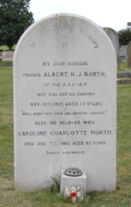 1891 census...Albert [1] was at Priory Road, Corsham with his father George [35] a quarryman born 'Pershet' (actually Manton), Wiltshire; his mother Elizabeth [39]; sisters Annie [11]; Rose [7], and Louise [3], all born in Corsham. 1901 census...Albert [11] was still at Priory Road with his parents and new siblings, Florence [8] and George [6] both born in Corsham. 1911 census...Albert [21] was a freestone quarrying picker and sawyer, living with his parents and brother George in Priory Street, Corsham. 2 of his siblings had died. He married Caroline Charlotte COE in Newmarket in Q1-1916 and they lived at Regent Cottage, Regent Street, Newmarket. He gave his residence as Corsham on enlistment in Whitehall, London, so presumably moved to Newmarket at the time of his marriage to Caroline. Their son, Walter Jack NORTH was born in Newmarket in 1917, died 2003 in Bury St Edmunds. |