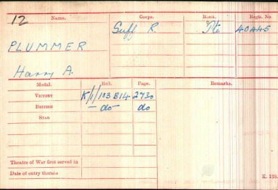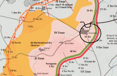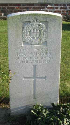 His death occurred near Armentieres, a defensive action on the River Lys. Early on the 9th April 1918 the 11th Suffolks were not in the front line, 101st Brigade was in Divisional reserve with the Cambridgeshire men billeted in and around La Rolanderie Farm. The following description of the start of the assault is taken from Lieut.Colonel J. Shakespeare's "The History of the Thirty Fourth Division 1915-1919": "After a quiet day and night, at four fifteen a.m. on the 9th April, the Boche guns to the South of our position spoke in an unmistakeable manner. The volume of sound was so great that it could only portend an attack on a considerable scale, and as the hours passed and there was no cessation to the din, we all realised that yet another "day" had arrived and all units and parties "stood to". The bombardment did not effect our front line, but our back areas got more than usual shelling. ... at 8:05 a.m. the 101st Brigade was ordered to stand to ... at 9 a.m. General Nicholson heard from the 40th Division that the enemy were in the front line on their right flank. An hour later came an order for the 101st Brigade to march to the south of Bac St Mar, and to act on the orders of 40th Division, as the Portugese front had broken ... the orders did not reach 101st Brigade HQ until 11:20 a.m. ... Bac St Mar was found to be in the hands of the enemy and the Brigade took up a defensive position near Fort Rompu ." The 11th Suffolks found themselves fighting alongside their sister regiment (12th Suffolks)and the ensuing action is described in the Suffolk Regiment - Official History: "Thus the first troops of the 34th Division to enter the general engagement were those who, almost up to that very moment, had formed the corps reserve, a rare tactical anomaly. Terrific fighting followed. On the 10th April the 11th Suffolks, having formed a defensive flank, beat off attack after attack. Twice the Germans broke through, but on one occasion the breach was closed by Captain Rodwell and his company, assisted by Major Wright. At 3:20 p.m. on the 10th Lieut.-Colonel Tuck received orders to withdraw behind the Lys. CGWC have his date of death as 19th, but he was missing from 9th. On the 9th the 11th Suffolks had 63 killed and the 12th had 9, of these just four have known graves, the rest are commemorated on the Ploegsteert Memorial |