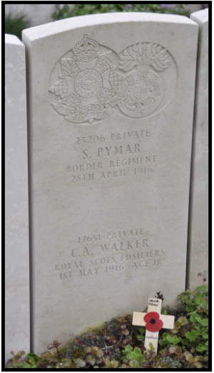 His records have survived albeit many pages are un-readable On February 1st 1915 he enlisted in the Norfolk Regiment, giving his age as 19 years, occupation as grocer and address at ? Farm, Seething, Norfolk. He was 5' 8" ( 172.7 cm) tall, chest 32" to 34" (81.3 to 86.4 cm). On his next of kin page he has crossed out father and replaced with mother and the address was Soham Stud, Newmarket, Suffolk. From the 3rd Battalion, Norfolk Regiment he was transferred to the 10th Battalion Border Regiment on 9th November 1915, being posted to France on 30th December 1915 (just in time to qualify for .the 1914-15 Star). There is nothing legible on line then until the notice to inform his relatives that he was seriously ill in General Hospital, St. Omer, dated 5th April 1916. This was followed by the notice of his death at 1050 a.m. on 28th April 1916 at St Omer, General Hospital from Cerebrospinal Fever. There follows a paper chase to find out where to send his effects, his mother's address being Mrs Minnie B Pymar, c/o Miss Birds, 14 Trafford Road, Norwich on 25th July 1916, cancelled out by a letter on 4th September 1919 to Mrs Minnie B. Pymar at 28 Victoria Street, Norwich. That was followed by a letter to Mrs Minnie Pymar at Soham Street, Newmarket, Suffolk, so they could send his death plaque and scroll. This appears to have been unsuccessful as on 27 May 1920 a further letter was sent to Victoria Street, Norwich and this time she replied that she was indeed still there. Mysteriously there are two pages, one regarding 23260 Private Spencer Llewelyn Hugh Spencer of the Border Regiment asking for any discharge papers as he "was killed in action" and a reply simply stated SLH Pymar was "dead". These however are both dated May 1938, so unless the date stamp had been set up wrongly, a further mystery exists. |