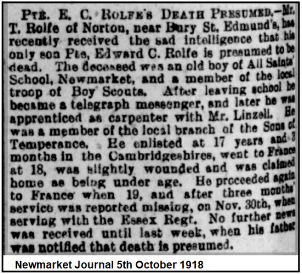 Born in Bury St.Edmunds on 26th June 1898 [Bury St.Edmunds 4a:842], baptised Bury St.Edmunds 10 July 1898, the eldest son of Thomas and Alice Mahala ROLFE