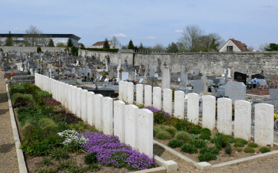 advance was slow - a mere 12 miles in one day. By 14th September, they were at Vailly on the River Aisne, north and slightly east of Paris and near Soissons. Their object was to cross the River Aisne which flows roughly east-west. They got across, but were then forced back to where they started - but then they crossed again and consolidated their position. The unit was by now so disorganised because it had lost so many officers and so tired that it came out of the line for a month to rest. 50 men were killed on 14th September and about another 120 wounded. Very few of the bodies were recovered and identified and most of the men are commemorated on the memorial at La Ferte sous Jouarre which is about 30 miles to the south. The German armies ceased their withdrawal where the First and Second Armies dug in, preparing trenches that were to last for several years. The British losses in this period exceeded 12,500 No. 5 C.C.S was stationed in Braine immediately it was captured on 12th September, so presumably this was where John died. As can be seen by the photograph below, the exact whereabouts of John's grave has been lost. He and some of his chums share headstones which simply state "known to be buried in this cemetery". |
