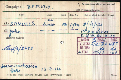 John Thomas SAMUELS, born in Wrexham, Denbighshire in Q2-1887 [Wrexham 11b:274] albeit this does not conform with his given age on enlistment. Not able to positively identify his family. His Army documents record his next of kin as father John SAMUELS, living at 18 Union Street, Glasgow in 1906 with his younger brother Frederick. Private John SAMUELS, born Wrexham, was serving with the 1st Battalion, Lincolnshire Regiment in Aden in the 1911 census. He was the grandson of Eliza SAMUEL (Newmarket Journal 24th October 1914) a widowed midwife (born Wrexham) living at 12 Granby Street, Newmarket. This was his address given on enlistment in 1906. John had enlisted in Bury St.Edmunds. (In "Soldiers Died" his residence is Blackford, Surrey ?) On enlistment into the 3rd Battalion Suffolk Regiment (No.7248) on 24th July 1906, he gave his place of birth as Wrexham, residence 12 Granby Street Newmarket, and his age as 18 years 6 months. He was single, 5 feet 4.25 inches (163.2 cm)tall, weighing 122 lbs (55.5 kg) and 31" (78.4 cm) chest. On 13th September 1906 he was transferred to the Lincolnshire Regiment. |